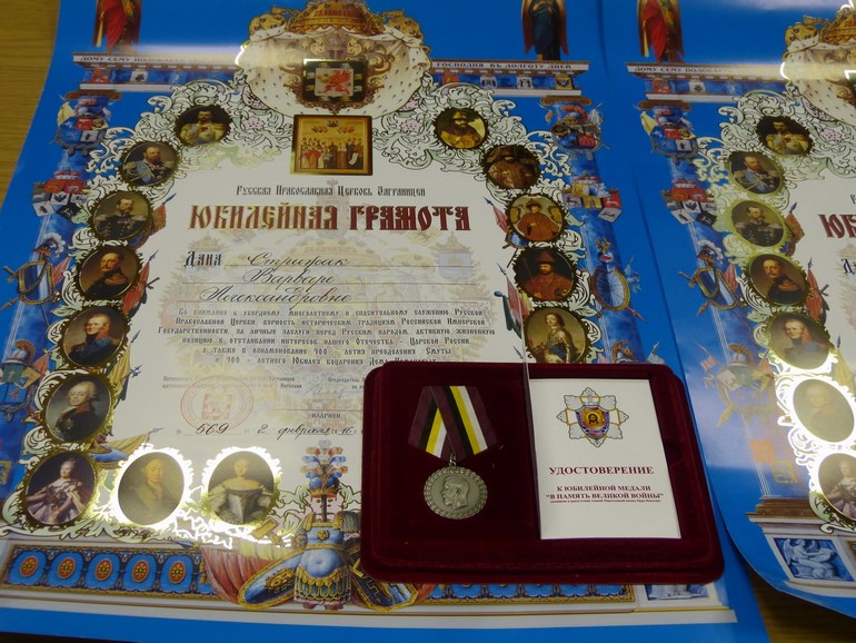 От лица Войсковой Православной Миссии (г. Москва) ее начальник И.Е. Смыков также вручил Юбилейную медаль, учрежденную к 100-летию Первой мировой войны, с изображением на лицевой стороне профиля Государя Николая Александровича Романова. За вклад в духовно-нравственное возрождение Отечества и помощь в проведении «Царских дней во Владивостоке», юбилейные медали были вручены: