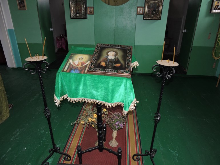 Мы зашли в его бедненький, но намоленный храм, это переделанный бывший садик, над которым возвышается небольшой куполок с крестом. Храм в честь Александра Свирского. Нам батюшка рассказал, что во время боевых действий чуть не каждый день люди приходили на службу, не было места как пройти на каждение. «Теперь уже не так. Видно полезно нам было, что бомбили, в храм не шли, а бежали… ».