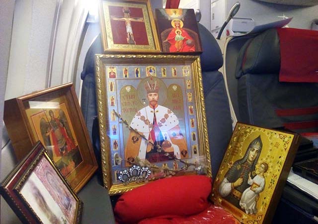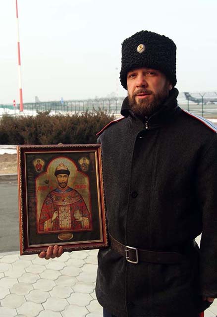 At the airport of Vladivostok, members of the Primorsky regional branch of the Society «Two Heads Eagle» headed by the head of the branch Igor Chernozatonsky and representatives of the Ussuriysk Cossack army arrived to worship the miracle-working icon of the Sovereign. At the meeting Chernozatonsky I. A. said: «This is the third visit of the miracle-working icon of Tsar-Martyr Nicholas II to Vladivostok and Primorsk region. She’s very revered and loved here.During the previous visits the icon bypassed Vladivostok’s Naval Procession, walked along the borders of Russia, China and DPRK, visited the opening of the monument to Emperor Nicholas II at the Pokrovsky Cathedral, visited Vladivostok’s fortress and detention facilities, comforting the prisoners. She drove by the cities of Primorsk Region. And everywhere she visited, her fragrance and myrrh streaming were taking place, bringing spiritual joy to Emperor Nicholas II’s admirers, strengthening in faith the little faithful and enlightening the lost”.