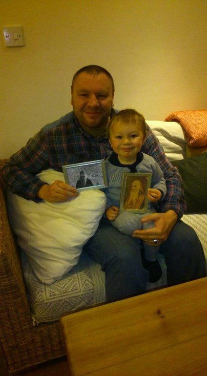 Наша духовная работа была сопряжена тем, что новобранца мы постоянно питали духовными книгами русских светил, потому его любимыми святыми, стали преп. Серафим Саровский, св. праведный Иоанн Кронштадтский, св. преп. Амвросий Оптинский, святитель Игнатий Брянчанинов, иромонах Серафим Роуз в их духовных книгах и упражнялся оглашенный (см. фото Иоанн с сыном, держат иконки). В нашем чате с Крэгом— более 10 000 сообщений, исключительно о вере. Невероятно но факт, некоторое время назад ему был голос Божий, который сказал прочесть книги отца Даниила Сысоева, что он и выполнил — правда отчасти, потому что они там практически недоступны, только если из России пришлют.