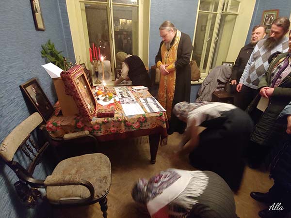 И вот спустя 15 лет — в связи с приездом Лоранс (Лаврентии) 29 декабря 2019 — в квартире на Гороховой иереем Сергием Чечаничевым была отслужена панихида по мученику Григорию, а затем в тёплой домашней обстановке прошло чаепитие, во время которого Лоранс не только отвечала на многочисленные вопросы, но и сама живо интересовалась всем, что связано с именем ее прадеда.