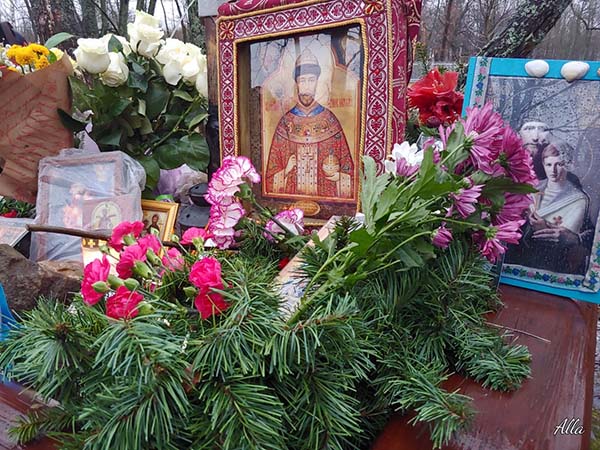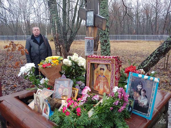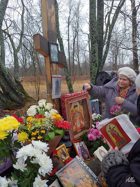 А в 14 часов к Поклонному Кресту пришли петербуржцы с мироточивой иконой Святого Царя Николая, которая к этому дню была специально доставлена из Москвы Игорем Смыковым, начальником Войсковой Православной Миссии. Протоиерей Алексий Успенский, священник храма Спаса-на-Сенной, отслужил панихиду по убиенному рабу Божию Григорию и всем его усопшим сродникам и молебен Святым Царственным Мученикам, по окончании которого все молящиеся приложились к мироточивому чудотворному образу Святого Царя Николая.
