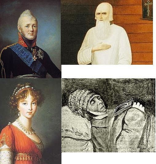 Слухи о том, что императрица Елизавета Алексеевна в действительности не умерла, но вслед за своим мужем «отреклась от мира», стали ходить вскоре после её смерти. Сложившаяся легенда звучала следующим образом: императрица, проезжая через Белёв, дала знать некой помещице (чьё имя никогда не называлось), что желает остановиться в её доме. По приезде императрица, прикрыв рукой глаза, посетовала, что в зале «слишком много света» и категорически приказала его «уменьшить», после чего слуги, бросившиеся выполнять приказание, оставили гореть только две свечи. После этого Елизавета Алексеевна, ссылаясь на усталость, пожелала остаться одна.