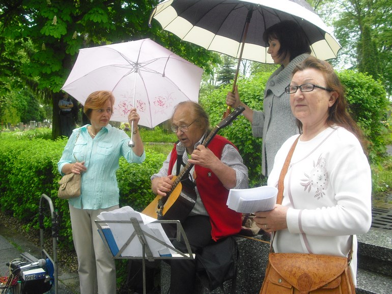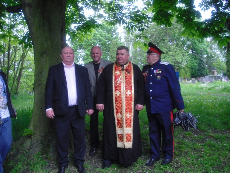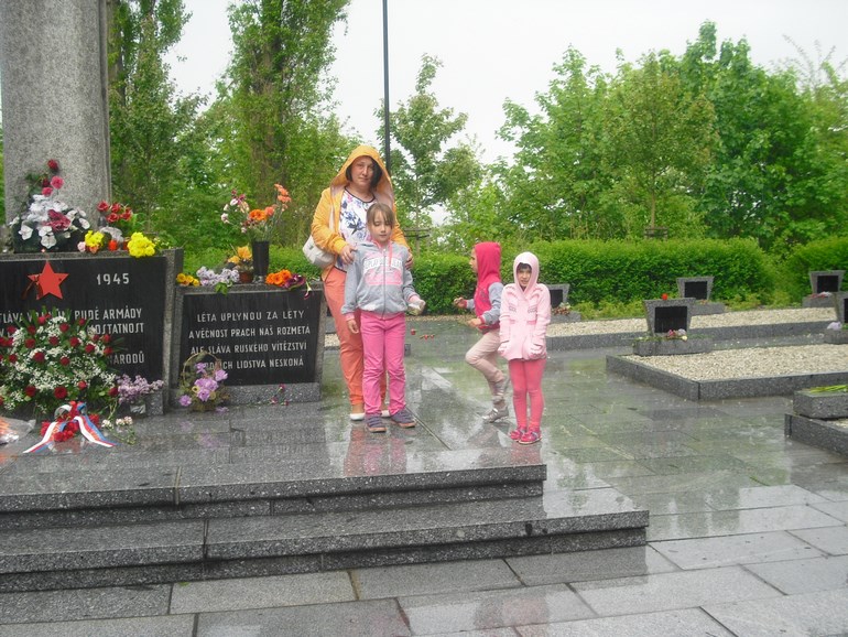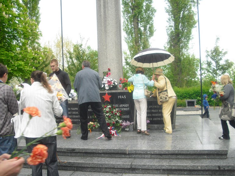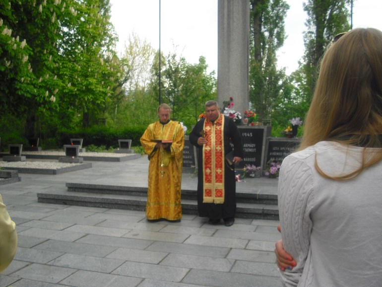 В 14:00 иерей Мирослав Вахата, настоятель двух храмов Воздвижения Креста Господня (г. Теплице) и Храма св. Вячеслава (г. Крупка) обратился со словами приветствия к собравшимся и предложил нам всем вместе Помянуть воинов. В проведении Панихиды ему помогал иподьякон Мартин и хор православного храма. Все вместе присутствующие пропели «Вечная память, блаженный покой», возложили венки, цветы и зажгли свечи на надгробиях. И начался настоящий ливень. Так вместе с нами плакали и небеса.