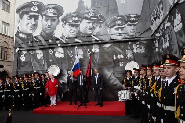 В центре столицы по адресу ул. Садовая-Каретная, д. 24/7 состоялось торжественное открытие арт-проекта граффити на фасадах зданий с изображением Героев Великой Отечественной войны.