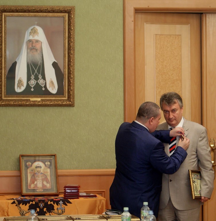 Затем в присутствии Чудотворной мироточивой иконы Государя Императора Николая Второго начальник Войсковой Православной Миссии Игорь Евгеньевич Смыков вручил православные награды.